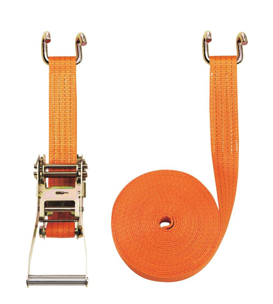 Zweiteiliger Zurrgurt, mit Rahmenhaken, 4000 daN zul. Zugkraft in der Umreifung, Gurtbreite 50 mm, Länge 4 m, Farbe orange, 4 Streifen, VE 2 Stück